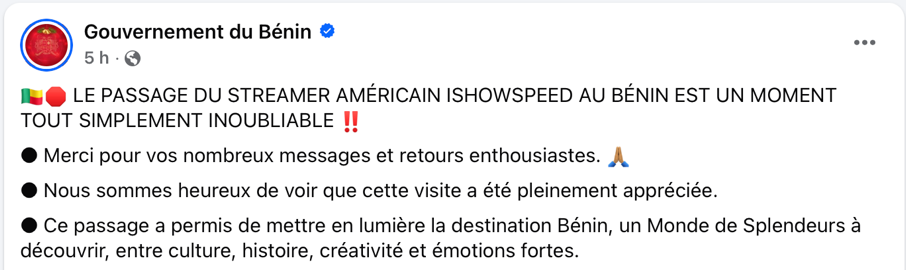 Contrairement à d’autres étapes, la visite béninoise est plus encadrée. Les autorités et les médias locaux ont clairement compris l’intérêt de cette exposition internationale, notamment auprès des jeunes publics qui consomment majoritairement des contenus digitaux. Le compte officiel VisitBenin relaie plusieurs séquences, notamment sur la place de l’Amazone à Cotonou. Le passage d’IShowSpeed lors des Vodun Days 2026 est également mis en avant, offrant une visibilité inédite à la culture vodun auprès d’une audience mondiale.